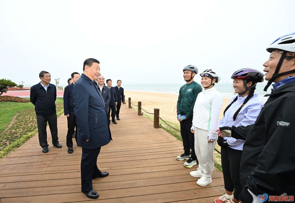 2024年5月22日至24日,中共中央总书记、国家主席、中央军委主席习近平在山东考察。这是22日下午,习近平在日照市阳光海岸绿道同市民亲切交流。新华社记者 谢环驰 摄