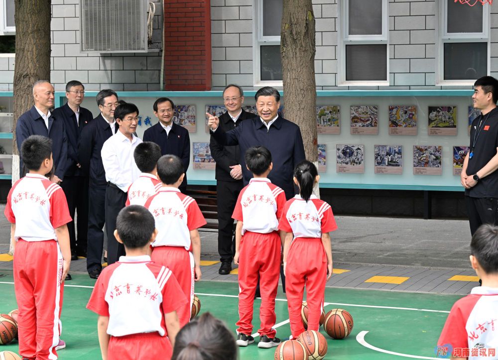 2023年5月31日上午,中共中央总书记、国家主席、中央军委主席习近平来到北京育英学校看望慰问师生,向全国广大少年儿童祝贺“六一”国际儿童节快乐。这是习近平在篮球场同正在上体育课的小学生们亲切交流。新华社记者 申宏 摄