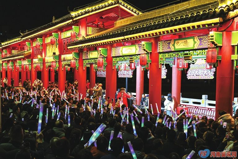 东廊桥戏舞荟好戏连台,豫剧雅韵邂逅现代舞姿,沉浸式演绎千年文脉;西廊桥“朝歌·城超”全民K歌大赛激情开麦,返乡游子、本地乡邻、八方游客轮番登场,经典老歌与新潮旋律共唱新春喜悦。入夜,画舫凌波,“朝歌夜宴”花船巡游惊艳亮相。乐声霓裳、光影流转,恍若穿越时空、梦回朝歌。